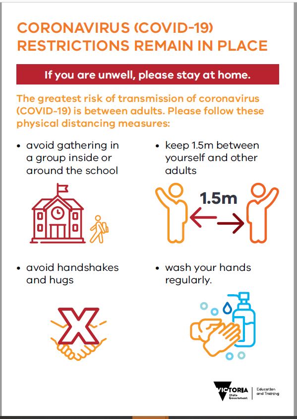 Based on the Chief Health Officer’s advice all secondary school students over the age of 12 no longer are required to wear a face mask indoors at school. However, it is strongly recommended to wear a mask indoors or if you are unable to maintain 1.5m social distance, unless lawfully exempted; persons must wear face masks while travelling to and from school and on public transport until advice otherwise and in primary schools.