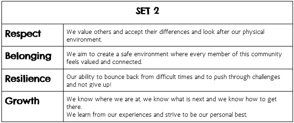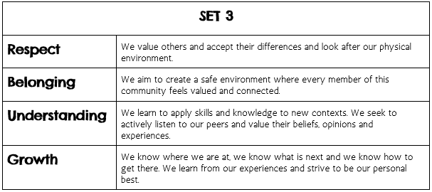 Over the last several months, at Craigieburn Secondary College, we have recently been reviewing our School Wide Positive Behaviour Supports, and the Values we want to develop within our community. After many discussions with students, staff, and members of the community, we have developed three sets of values that we are asking the College Community - students, teachers, families - to vote on. These sets are Values that we feel support the growth of our College and community.